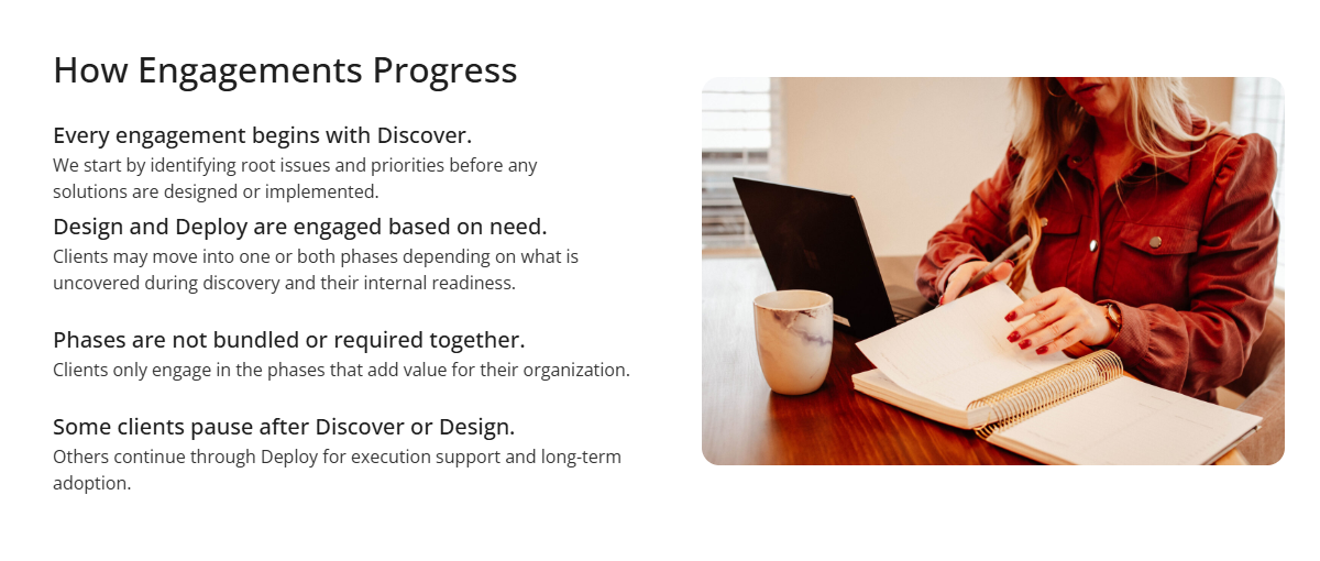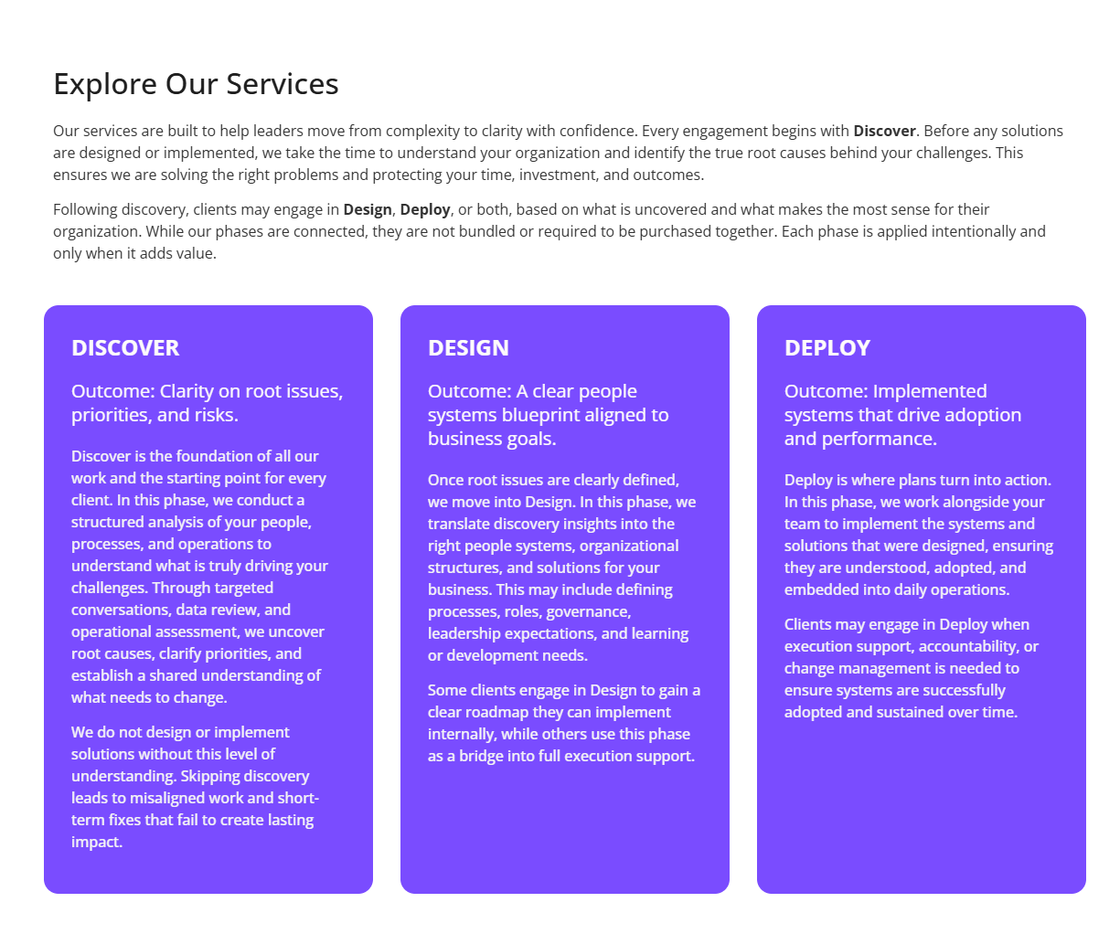We are a Leadership Development and Operations Consulting firm that identifies your operational gaps, prescribes targeted solutions, and implements the systems that create clarity, alignment, and consistent performance.